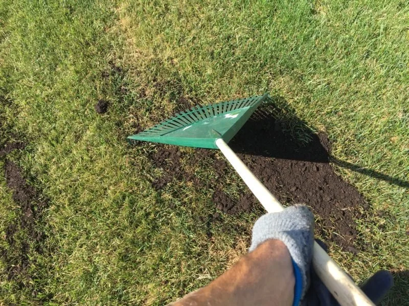 Once Sweet Peet® is spread, rake it in so the grass stands up through the material. This ensures even contact with the soil and better integration.